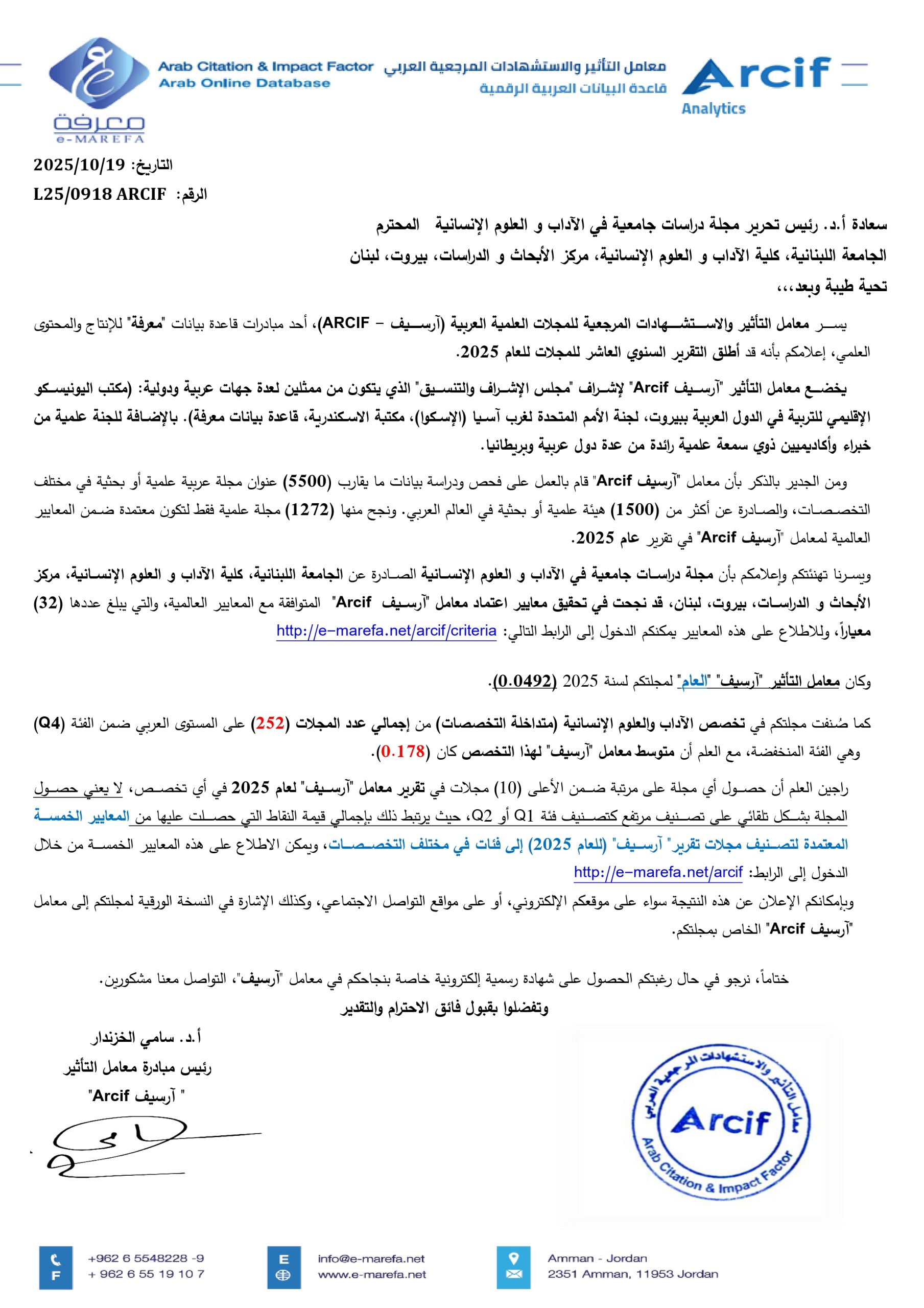 وهذا ما يجب أن يعبّر عنه من خلال مجلة دراسات جامعية في الآداب والعلوم الإنسانية الرقمية المحكمة التي تصدر عن مركز الأبحاث التابع للكلية فصليًّا، كون البحث العلميّ في كلية الآداب والعلوم الإنسانية من المفترض أن يُقونن ويُؤطّر في أطر معرفيّة، ويُنشر ويُعرف به في العالم.